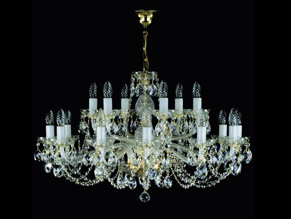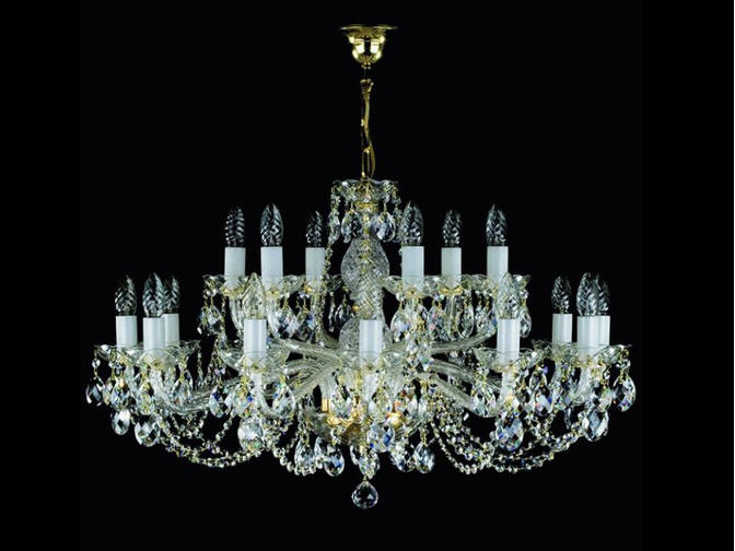 Классическая двухъярусная рожковая люстра от ArtGlass. 18 стеклянных рожков размещены в два яруса, что позволило сделать люстру довольно компактной. Вместе с подвесками типа "миндаль" использованы хрустальные гирлянды.